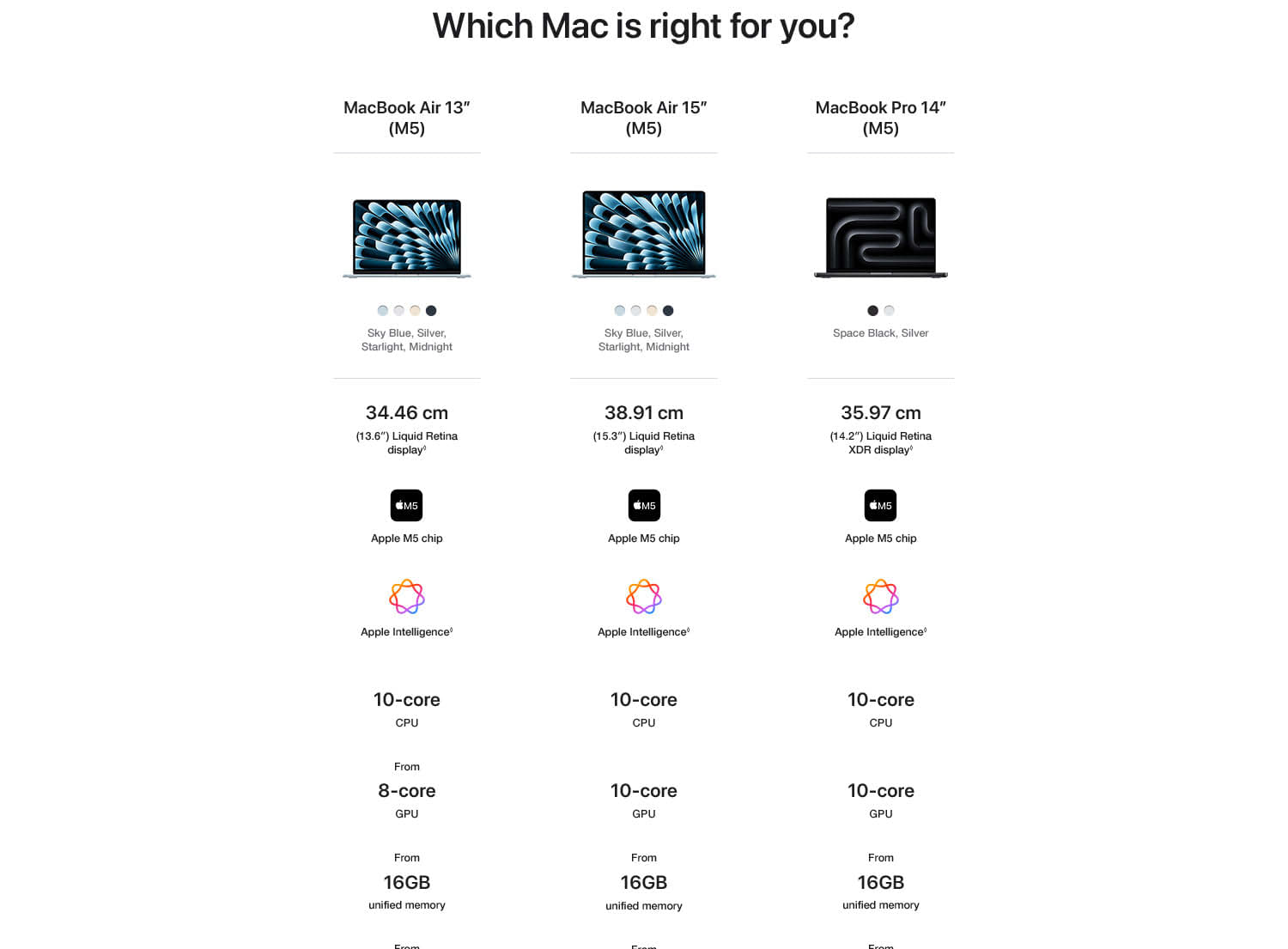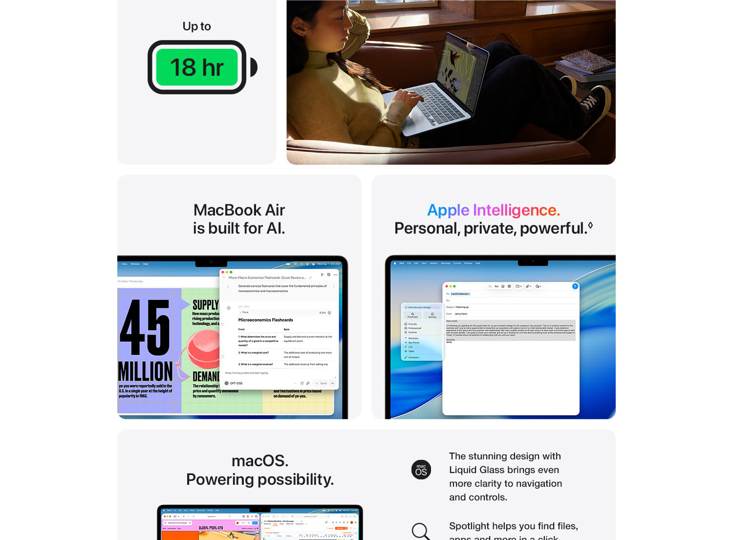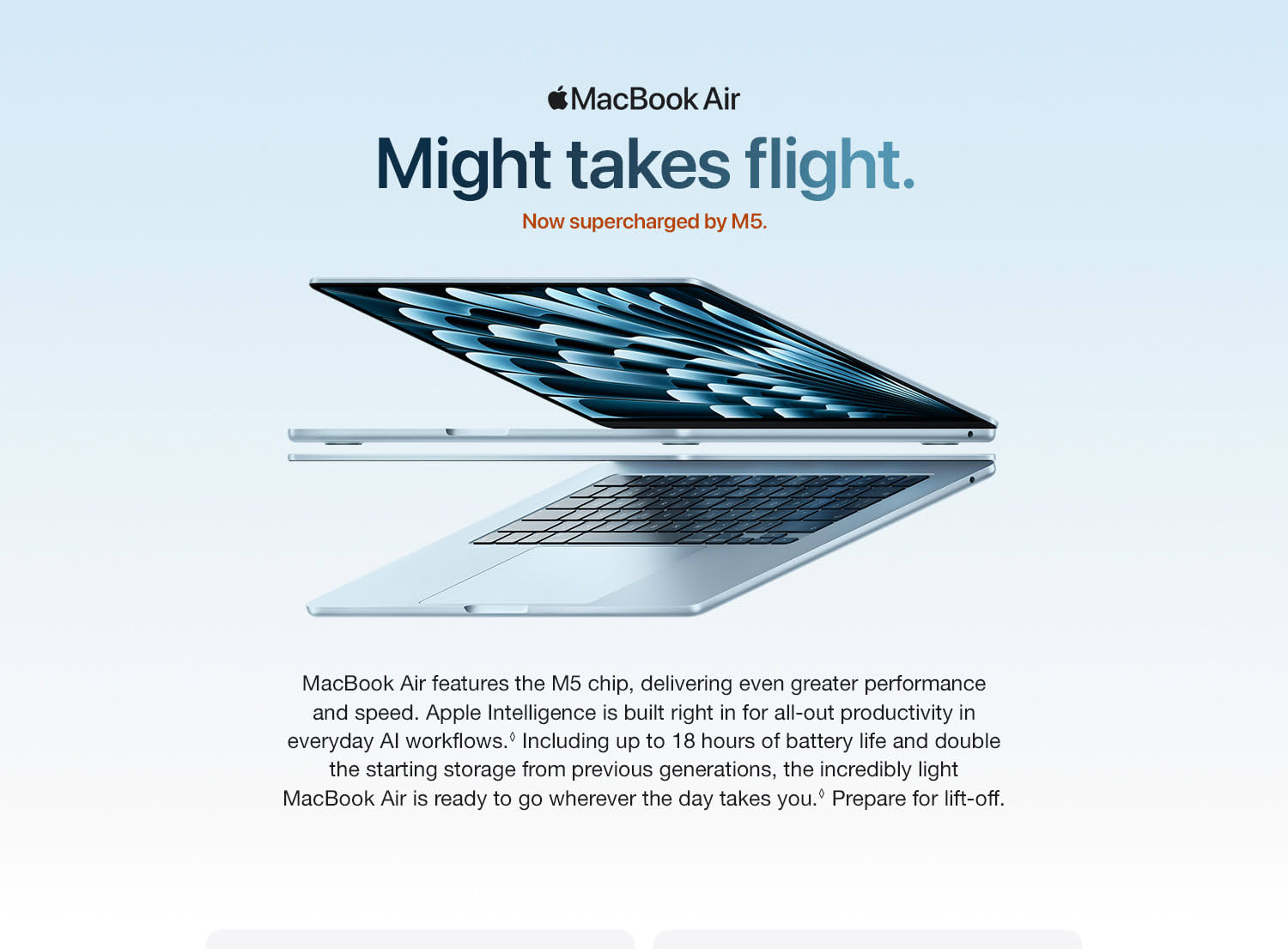 MacBook Air with the M5 chip packs blazing speed and powerful AI capabilities into an incredibly portable design. With Apple Intelligence, up to 18 hours of battery life and fast SSD storage starting from 512GB, you can work, create and play anywhere life takes you.